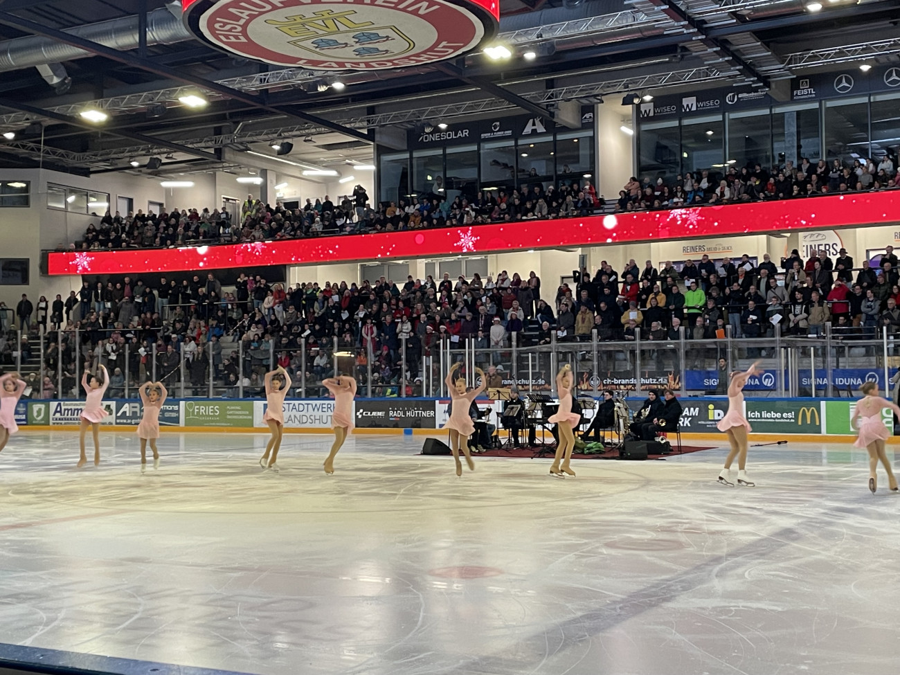 Neben der Musik sorgten auch Eiskunstlaufdarbietungen für besondere Akzente. Die Eiskunstläuferin Amelie Fischer, Drittplatzierte der Bayerischen Nachwuchsmeisterschaft 2025, präsentierte ein Solo zu „Hallelujah“ auf dem Eis. Später zeigte die gesamte Eiskunstlaufabteilung des EV Landshut mit Läuferinnen und Läufern aus allen Leistungskategorien eine Show unter dem Titel „Polarexpress“, die mit Schnee, Schwung und sichtbarer Vorfreude auf Weihnachten das Programm bereicherte.