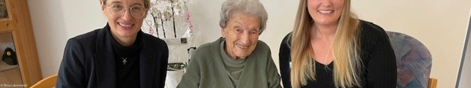Zum 95. Geburtstag von Ruth Loupal gratulierten Dekanin Dr. Nina Lubomierski und Einrichtungsleiterin Stephanie Högl des Matthäusstifts in Landshut der rüstigen Bewohnerin. Angeregt erzählt die Jubilarin von ihrer Kindheit in Schlesien und auch von der bedrückenden Zeit während des zweitens Weltkriegs.